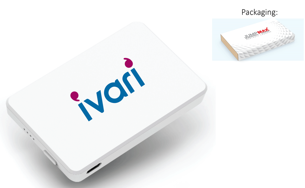 Individually packaged in a JumpMax box. Includes Ivari logo printed on top of device.